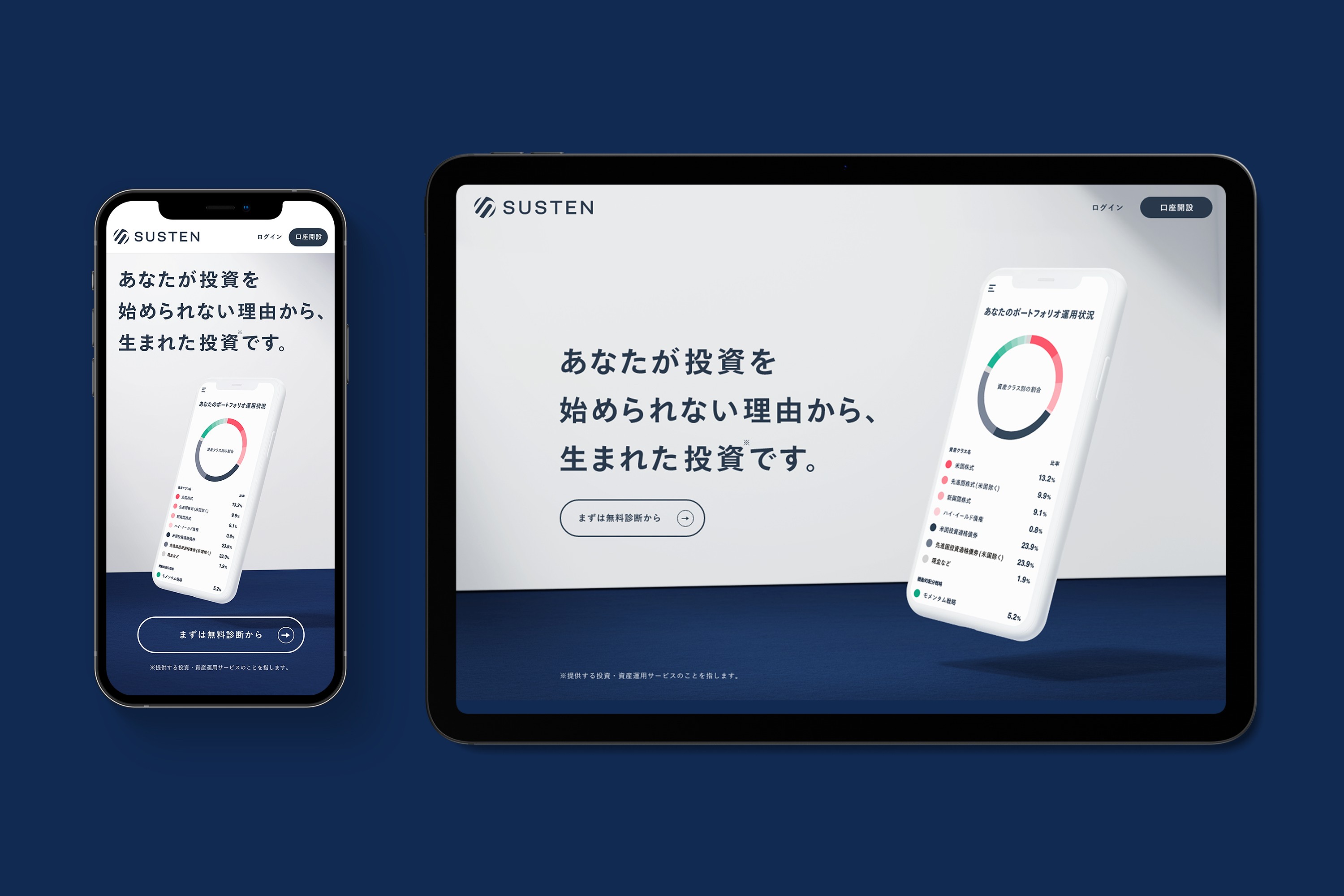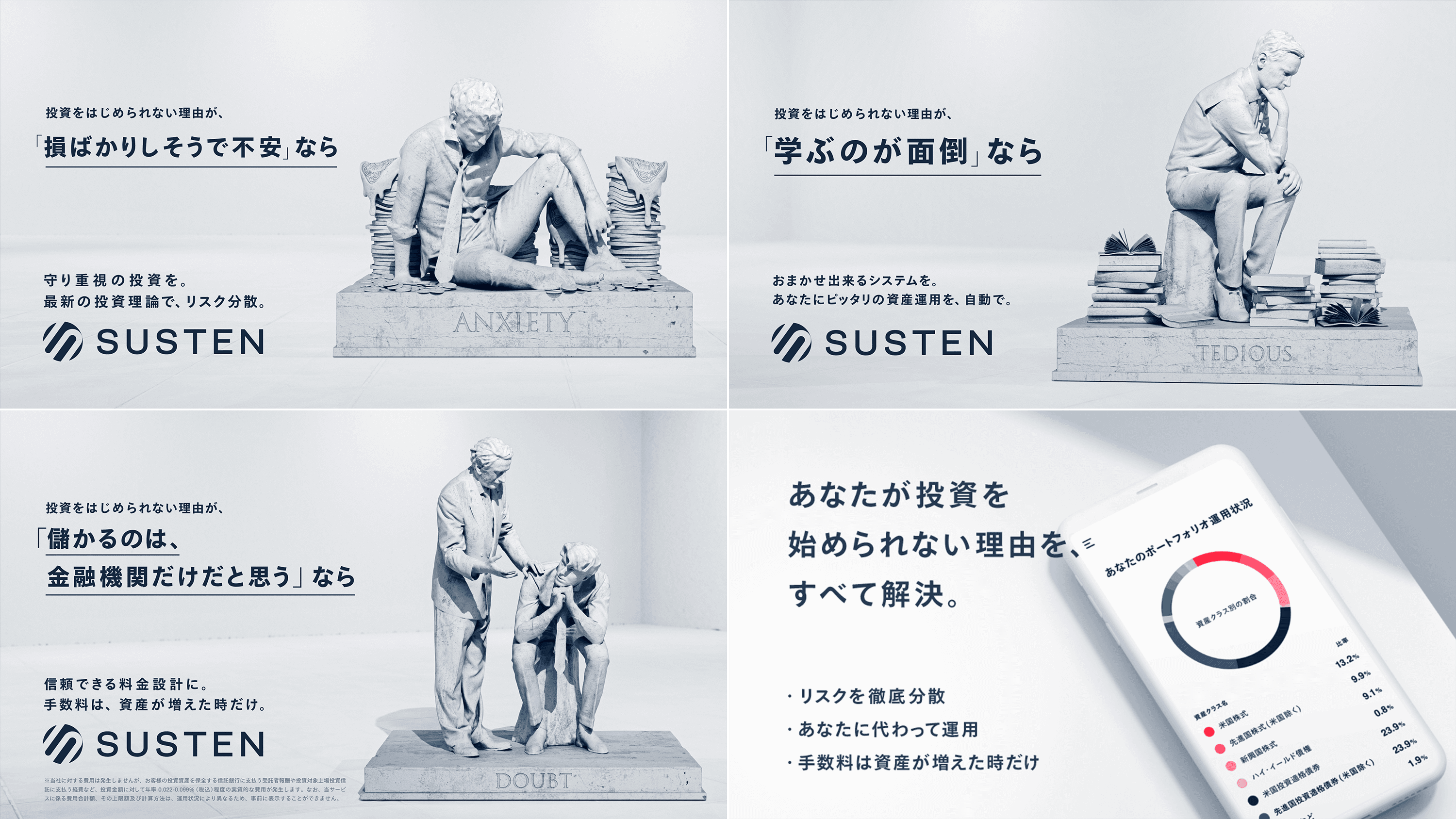 資産運用サービス「SUSTEN」のブランドCM企画。投資への関心が高まる一方で、難解さや不安から一歩を踏み出せない人が多い社会背景に着目。「あなたが投資を始められない理由から、生まれた投資です。」を軸に、迷いや不信感を正面から受け止めるメッセージを設計。プランニング・アートディレクションを担当。